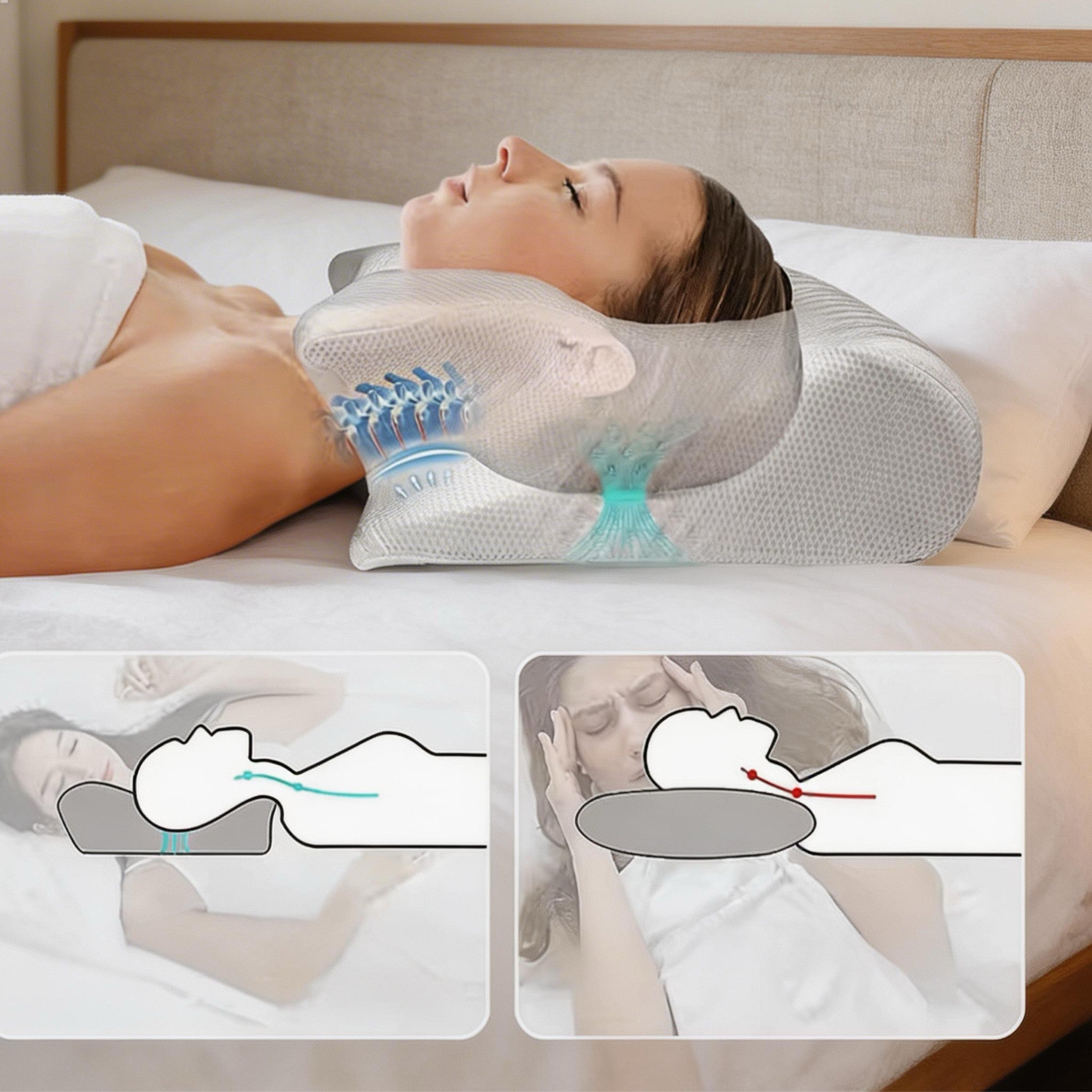 Contrairement aux oreillers traditionnels, sa forme ergonomique épouse les contours du cou et de la tête.